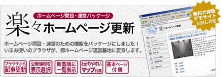 『楽々ホームページ更新』は、説明書がなくても操作がわかり、掲載する文章と写真さえあれば、特別なアプリケーションを使うことなくカンタンにホームページを作れます。また、日々の更新についてもいまお使いのブラウザからリアルタイムに行えますので、作業時間を大幅に短縮できます。