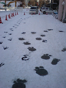 雪の上に雪だるま? と、なにか足跡らしき絵が描いてあります。