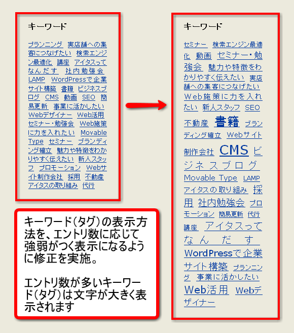 タグクラウドの表示方法を変更した理由には、エントリとして発信しているキーワードを強弱表示することで、メリハリをつけて情報を拾いやすくするという意図があります。