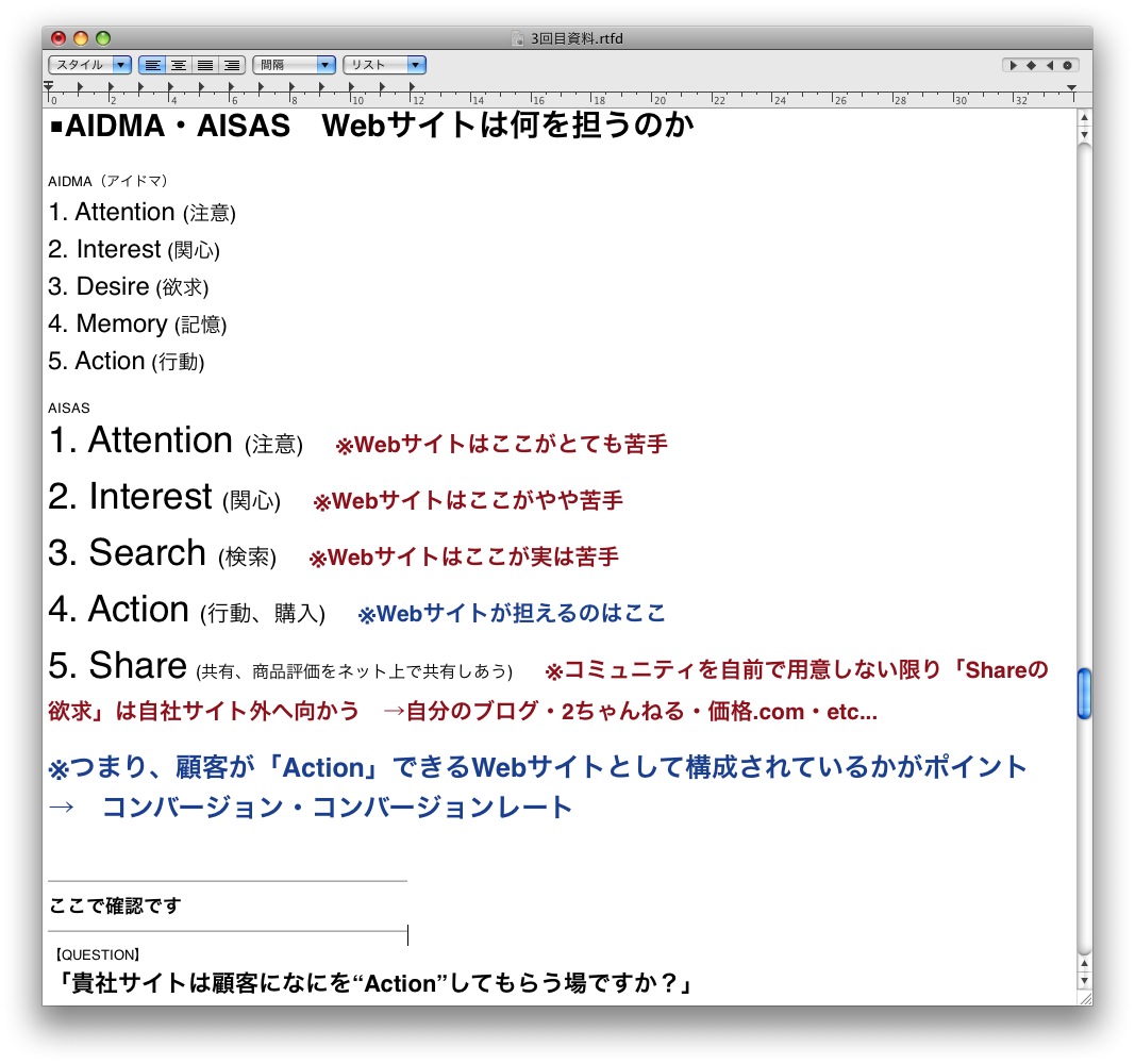 続いてAIDMA・AISASのお話。うーん、こうして見るとWebサイトでできることはとても限られているような……。