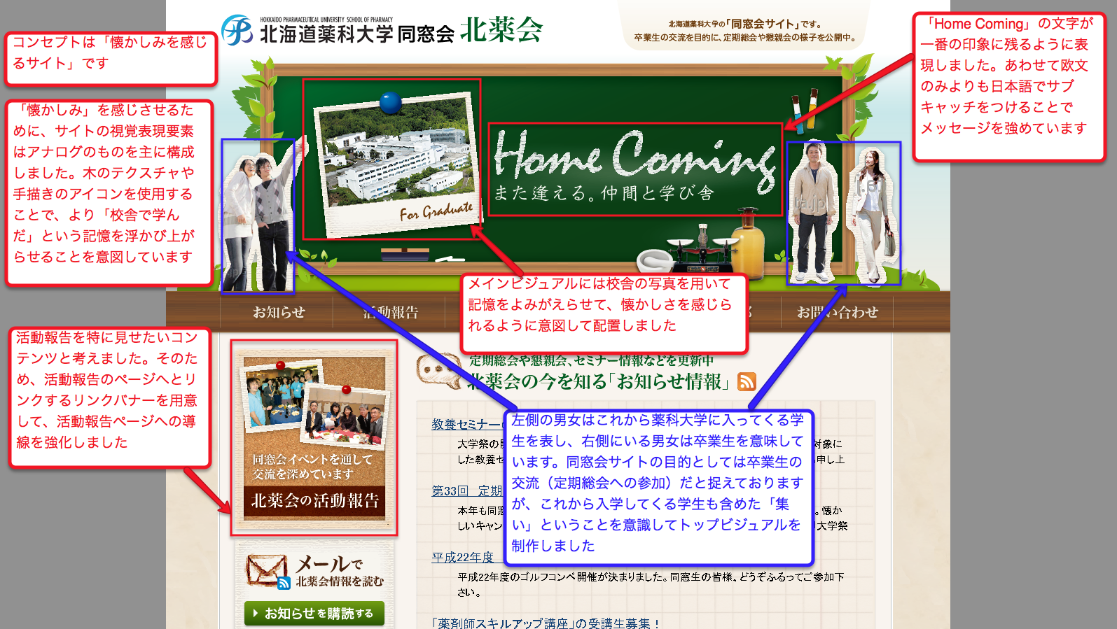 - 北海道薬科大学同窓会(北薬会)様 同窓生の参加数向上を目的として「懐かしさを感じられるサイト」をコンセプトにリニューアル