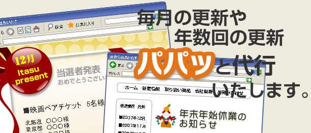 ホームページの更新はもちろん、アイタスでは「ここ、こうしてはいかがでしょう?」など、一緒に良いものを作り上げるためのパートナーとしてお手伝いいたします。更新ボリューム・頻度により料金が変動しますので、まずはお問い合わせください。